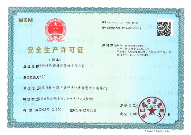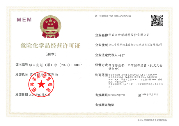 紹興興欣新材料股份有限公司成立于2002年06月27日,占地面積122畝,位于杭州灣上虞經(jīng)濟(jì)技術(shù)開發(fā)區(qū)拓展路2號,現(xiàn)有職工200余人,專業(yè)技術(shù)人員50余人;博士、碩士研究生30余人組成的一支知識型、專業(yè)化的技術(shù)科研團(tuán)隊。公司面向全球市場,專業(yè)開發(fā)電子化學(xué)品、環(huán)保化學(xué)品、醫(yī)藥中間體、高分子材料等先進(jìn)新材料重點(diǎn)領(lǐng)域的省級科技型企業(yè);建有浙江上虞、安徽東至兩個生產(chǎn)基地。目前為“國家高新技術(shù)企業(yè)”、浙江省“隱形冠軍”企業(yè)、浙江省專精特新中小企業(yè);建有“省級”研究開發(fā)中心,共建天津大學(xué)浙江紹興研究院電子化學(xué)品研發(fā)中心。